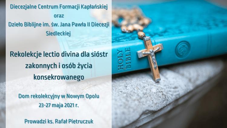 Diecezjalne Centrum Formacji Kapłańskiej oraz Dzieło Biblijne im. św. Jana Pawła II diecezji siedleckiej zapraszają siostry zakonne oraz osoby życia konsekrowanego na rekolekcje w formie lectio divina, które odbędą się w dniach 23-27 maja 2021 r. w Domu Rekolekcyjnym w Nowym Opolu.