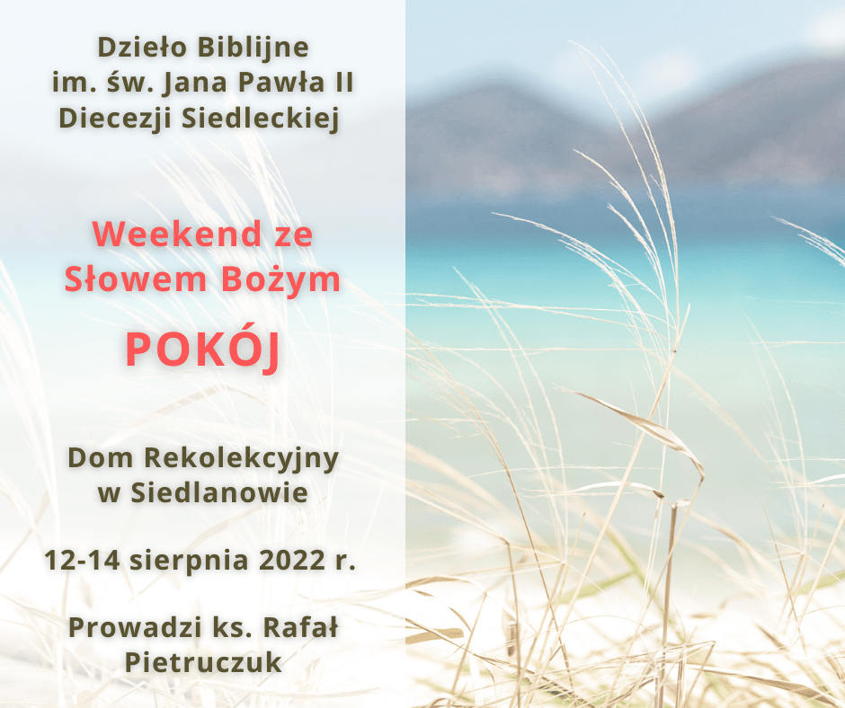Czy pokój to jedynie brak wojny? A może pokój to ogólnie pojęty dobrobyt i brak zmartwień? Jakiego rodzaju pokój zapowiadali starotestamentalni prorocy? Czym w swej istocie jest pokój Chrystusowy? Jak zachować pokój serca pośród zabieganej i chaotycznej codzienności? Odpowiedzi na te i wiele innych pytań będą szukać uczestnicy rekolekcji z cyklu „Weekend ze Słowem Bożym”, które odbędą się w dniach 12-14 sierpnia 2022 r. w domu rekolekcyjnym w Siedlanowie pod Radzyniem Podlaskim.