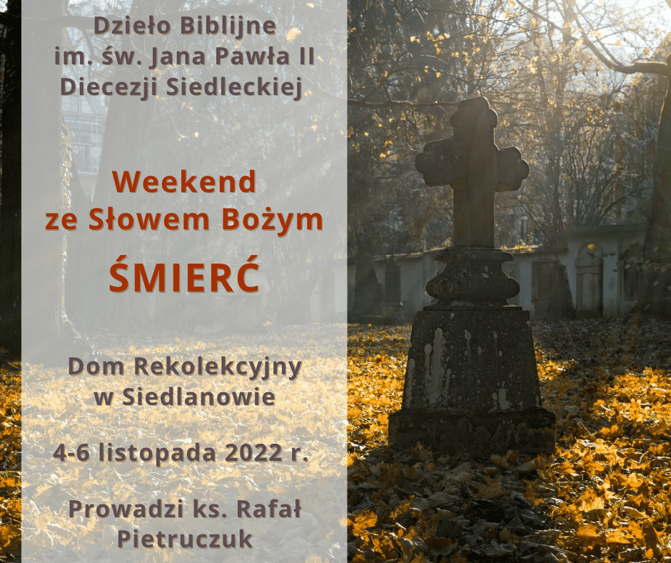 Dla nas, będących jeszcze na tym świecie, pierwsze dni listopada to wyjątkowa okazja do refleksji nad przemijalnością i koniecznością przygotowania się na moment odejścia. Dlatego właśnie w tym czasie chcielibyśmy serdecznie zaprosić na rekolekcje z cyklu „Weekend ze Słowem Bożym”, które poświęcone będą biblijnej nauce o śmierci. Ćwiczenia duchowe odbędą się w dniach 4-6 listopada 2022 r. w Domu Rekolekcyjnym w Siedlanowie. W programie oprócz konferencji biblijnych, przewidziano wprowadzenie w modlitwę słowem Bożym, Eucharystię, możliwość spowiedzi oraz adorację Najświętszego Sakramentu.